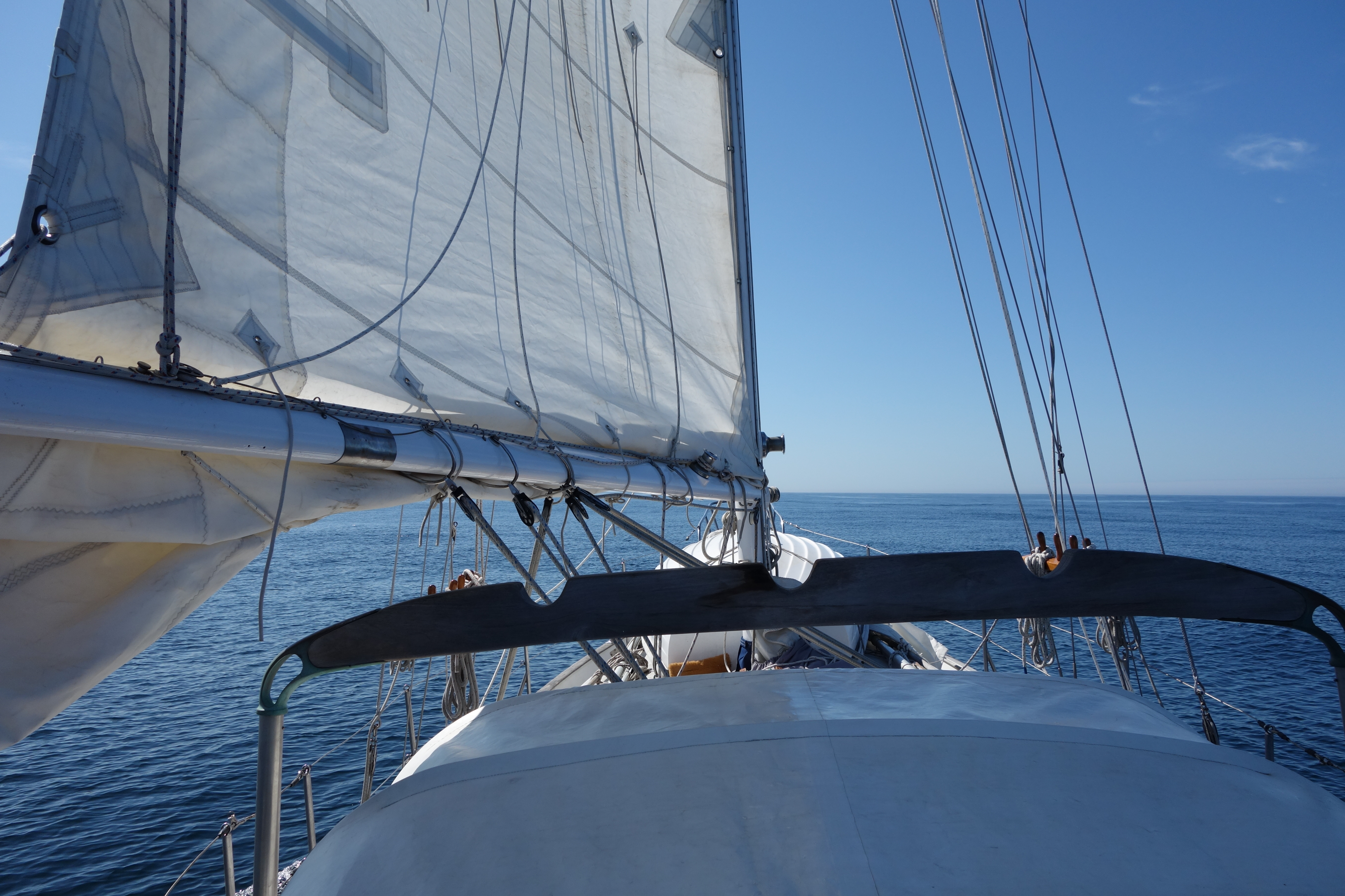 We got out of Grey’s Harbor on the morning of the 14th. It was overcast and breezy, and we sailed through the night on a double-reefed main and staysail. Morning broke clear, with lighter air, and the sail around Cape Blanco was sunny, warm, 6 kts under one-reef and a half-furled genoa. We had a beautiful sail through the night even with the light SW winds, reaching out to about 30 miles, then pointing back toward shore in the  morning.  By late afternoon, we could see the cold front due west coming in. Sooner than expected.