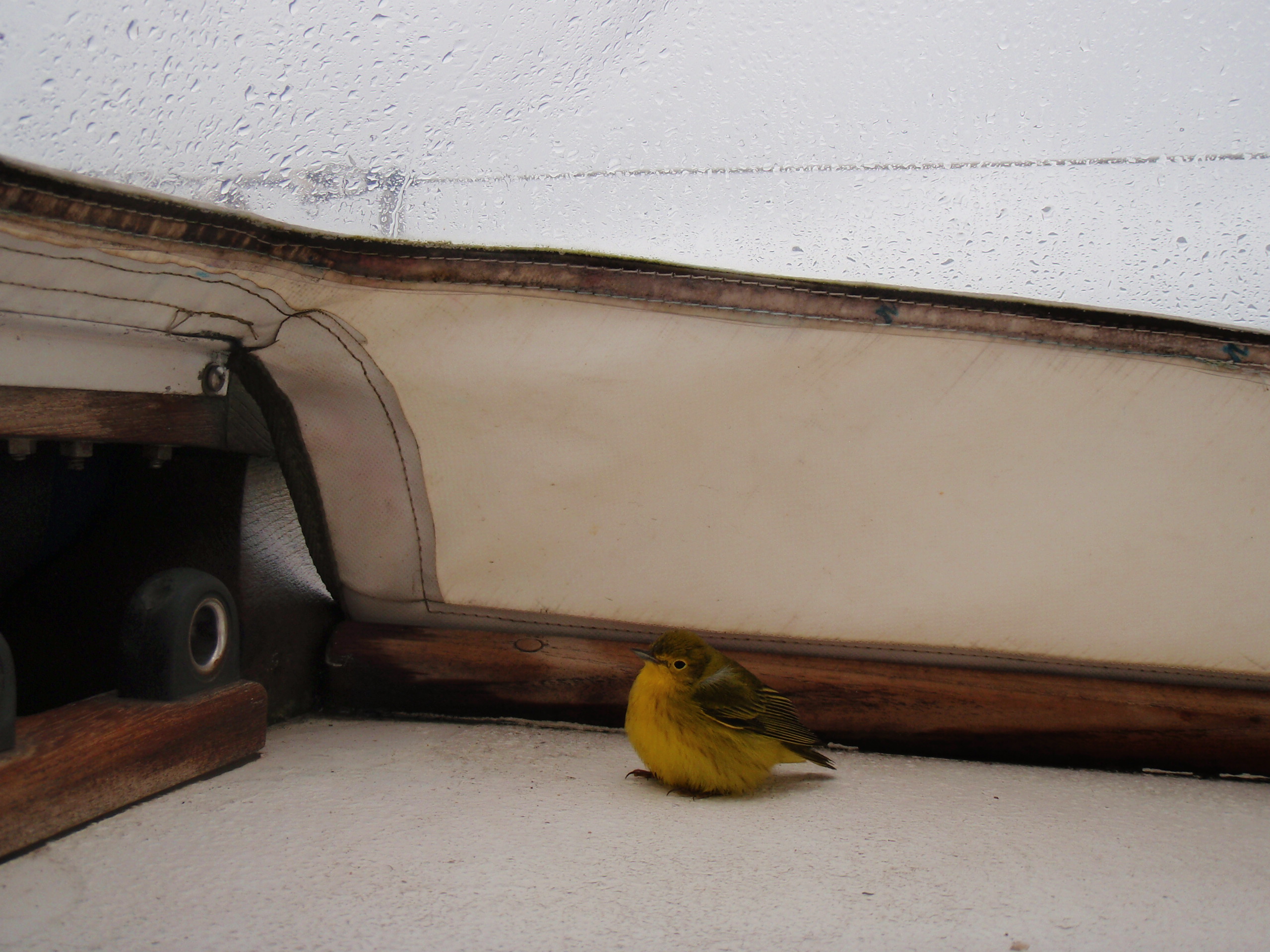 As the day grew colder,  misty, adn starting to shower, a diminutive hitch-hiker joined us for half an hour.  Out of nowhere and 20 miles from shore, a migrating yellow warbler (sp.?) dropped from the clouds and landed on the aft deck. It hopped around looking for a spot out of the wind and rain, settling in for a snooze once or twice. After a while, it hopped off the starboard quarter. We hope it cleared the leaping wave crests.