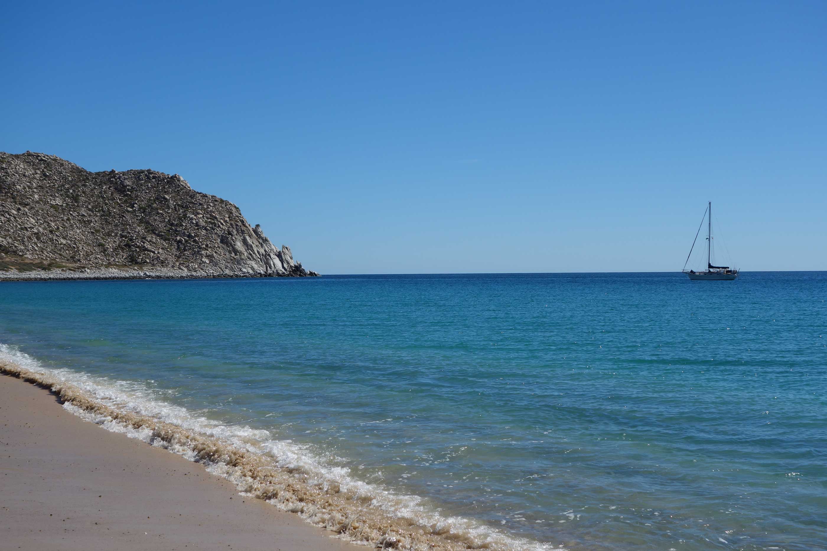 Carla was tired from not sleeping at Cabo for three days, so the winds and swells may have seemed stronger than they actually were. But we have read that conditions along this part of the coast can be strange, where the whole stretch of the Pacific and the southeast-bound California current runs into the southwest-bound Gulf current pouring out from the Sea of Cortez. Regardless of why, the waves were short, steep, and coming from two directions, all while we were hard on the wind. The Monitor windvane handled it very well on one tack, but not on the other, so we were still obliged to hand steer half the time. Pelican Moon did beautifully, maintaining a steady motion as she cut through the breaking swells. It was a relief when the dawn finally allowed us to enter the bay at Los Frailes (The Friars), where a handful of boats bobbed peacefully at anchor only a few hundred feet from the frothing sea outside.