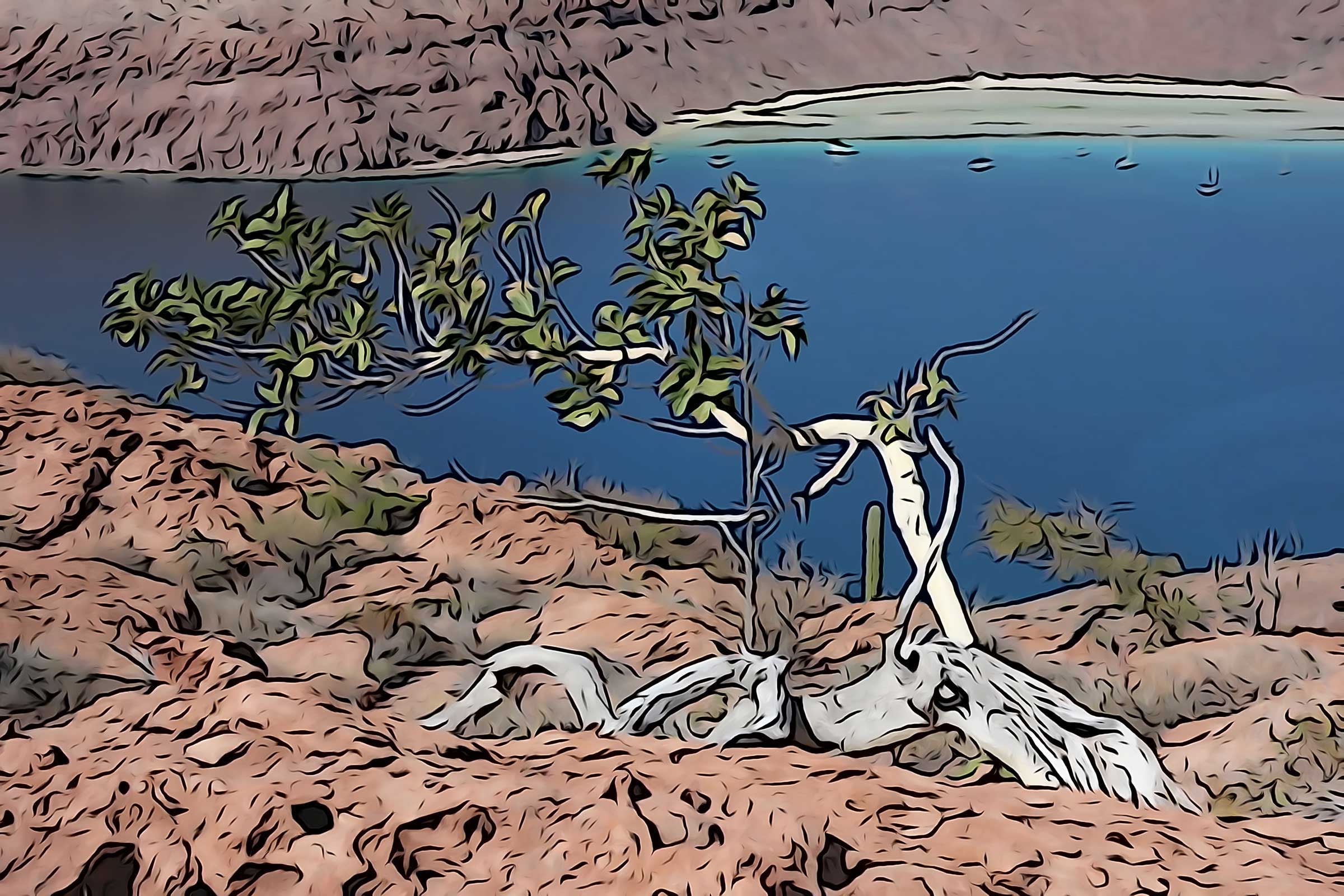 But here, where desert islands bereft of fresh water are surrounded by the undrinkable sea, which is in turn bound by desert lands even more barren, there is no casual encounter with wilderness. On our adventures, every water bottle we have is full; the large first aid pack comes along, as well as extra clothing and snacks in case our casual 5 mile roundtrip hike across the island turns epic. A single night and extra day out here with a minor injury could be disastrous. We have no map, so we even haul the satellite messenger with us, since no one, including ourselves, really knows where we are, or when we expect to be back. With only a couple of exceptions, we have been making our own trails, and those have been careful, meticulous scrambles up boulder-chocked arroyos, over rim rock cliffs of ragged, rhyolitic ash flows, across plateaus blackened by sun and occasionally shaded by squat, stunted, mostly leafless trees and the ever present cacti. And what are we finding out here?