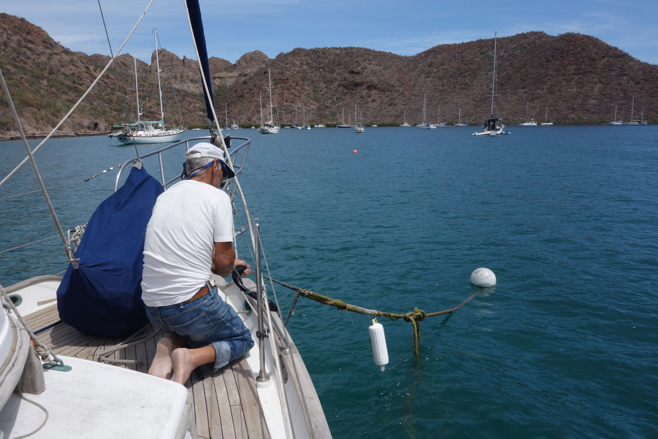 The massive development at Puerto Escondido was designed and implemented by FONATUR, the federal trust fund for developing tourism. FONATUR has a reputation for building infrastructure ahead of demand, and Puerto Escondido has miles of paved roads slowly crumbling back into the desert, luxury condominiums half-built, unrepaired concrete docks broken into pieces by hurricanes years ago, offices, stores and bars that are open when convenient, not when posted, no hot water in the showers, no TP in the restrooms. But there is just enough money available to pay half wages to the remaining employees, who manage the marina and harbor affairs, who stand guard at the road entrance, keep the flowers watered, clean the grounds, paint the flagpoles and the palm trunks, rake the empty dirt lots and assist all the cruisers. Best of all, a certified diver has a business in one of the high rises, and black-holed boaters pay him to set up heavy concrete moorings for them in the Waiting Room and the Ellipse, which allow them to permanently avoid the main harbor, which FONATUR has mostly filled with official mooring balls, the use of which costs a pretty penny. But not very many pretty pennies flow into the federal coffers anymore, because who wants to pay for cold showers, or mooring balls whose anchors may drift when a stiff wind blows?