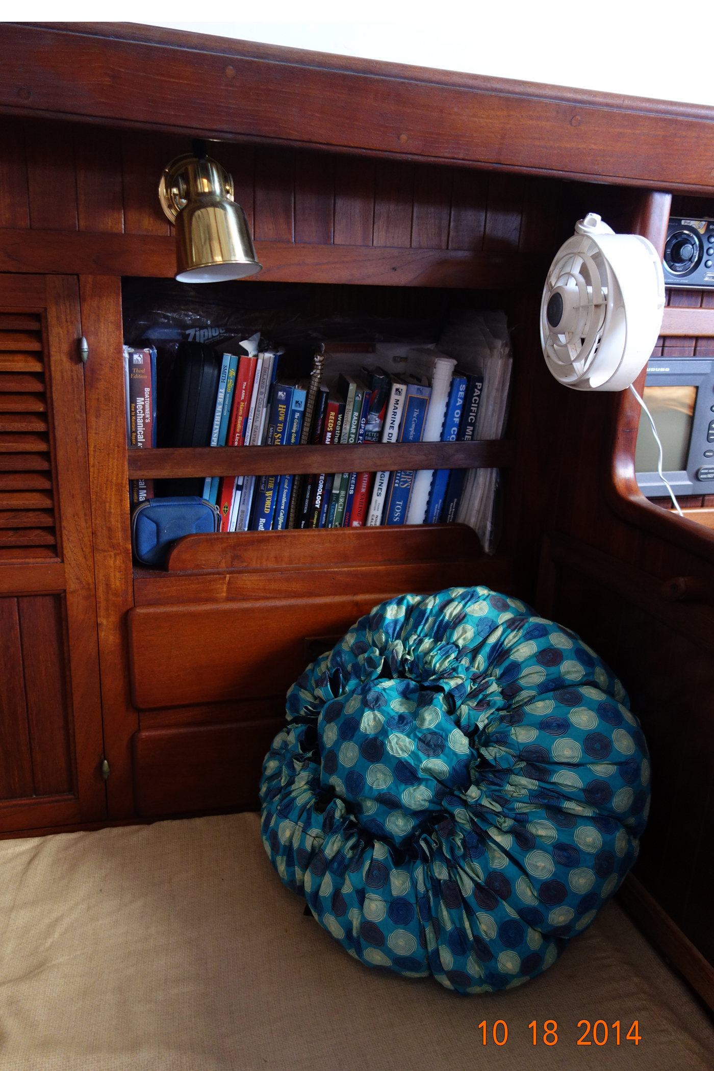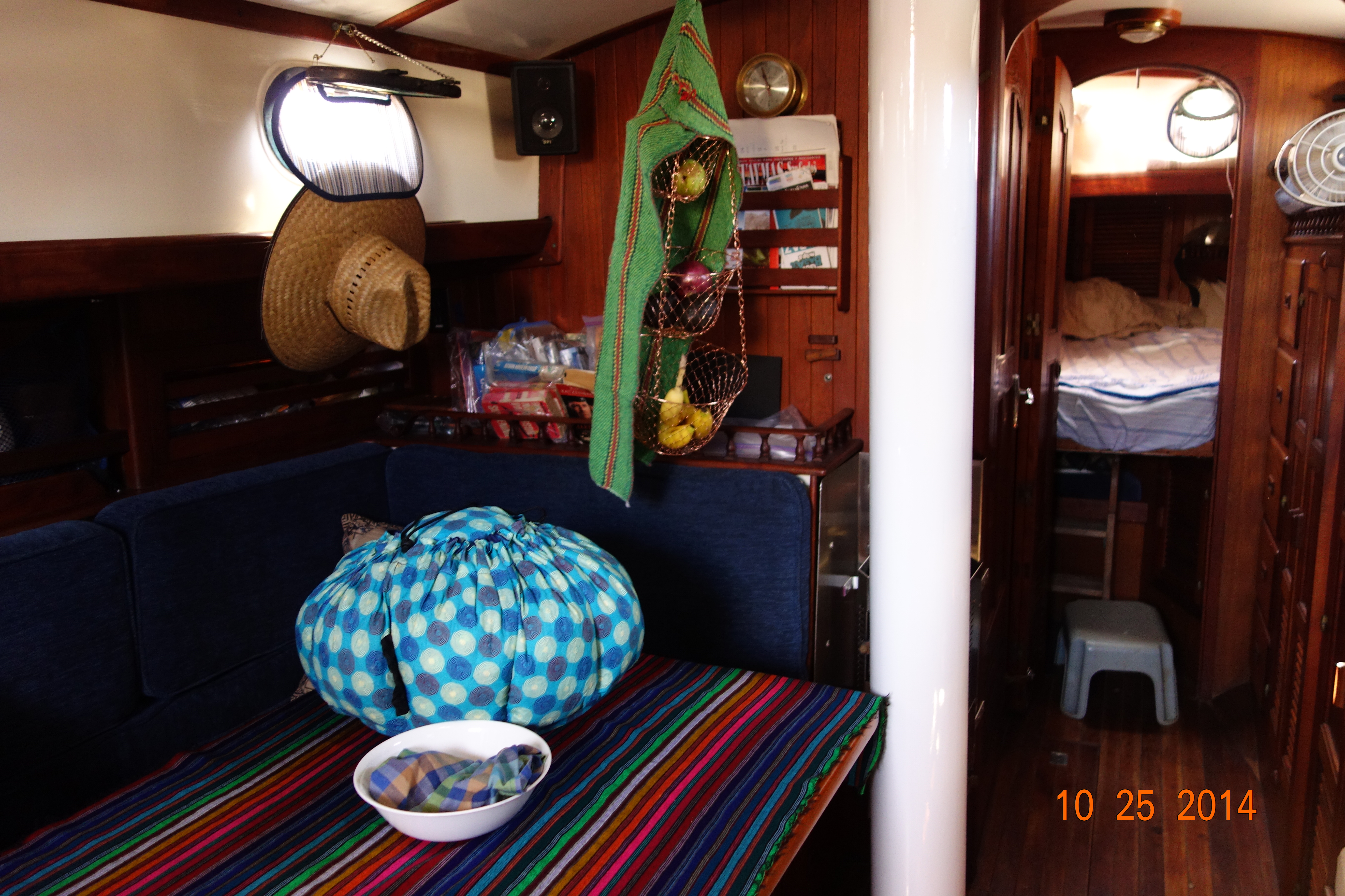 Our new GoalZero battery charger hooked up to Nomad 13 solar panels, while charging the iPad. (Doesn’t look like it in the picture, but this method is keeping the charger and the iPad in the cool shade while the solar panels are on top of the butterfly hatch, which is tilted to the perfect angle. Turns out, it’s a great setup, and the iPad came to a 90% charge in only four hours!