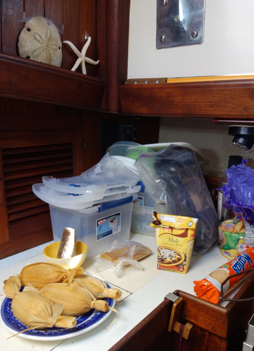 For the last three days last spring, and the first 6 days in the work yard this fall, we stayed in a small apartment and daily walked back and forth to the boat, passing a large grocery store each time. We were a little addicted to the fresh tamales, and the boxed mole sauce is darn tasty, too, not too sweet, lots of chile flavor.