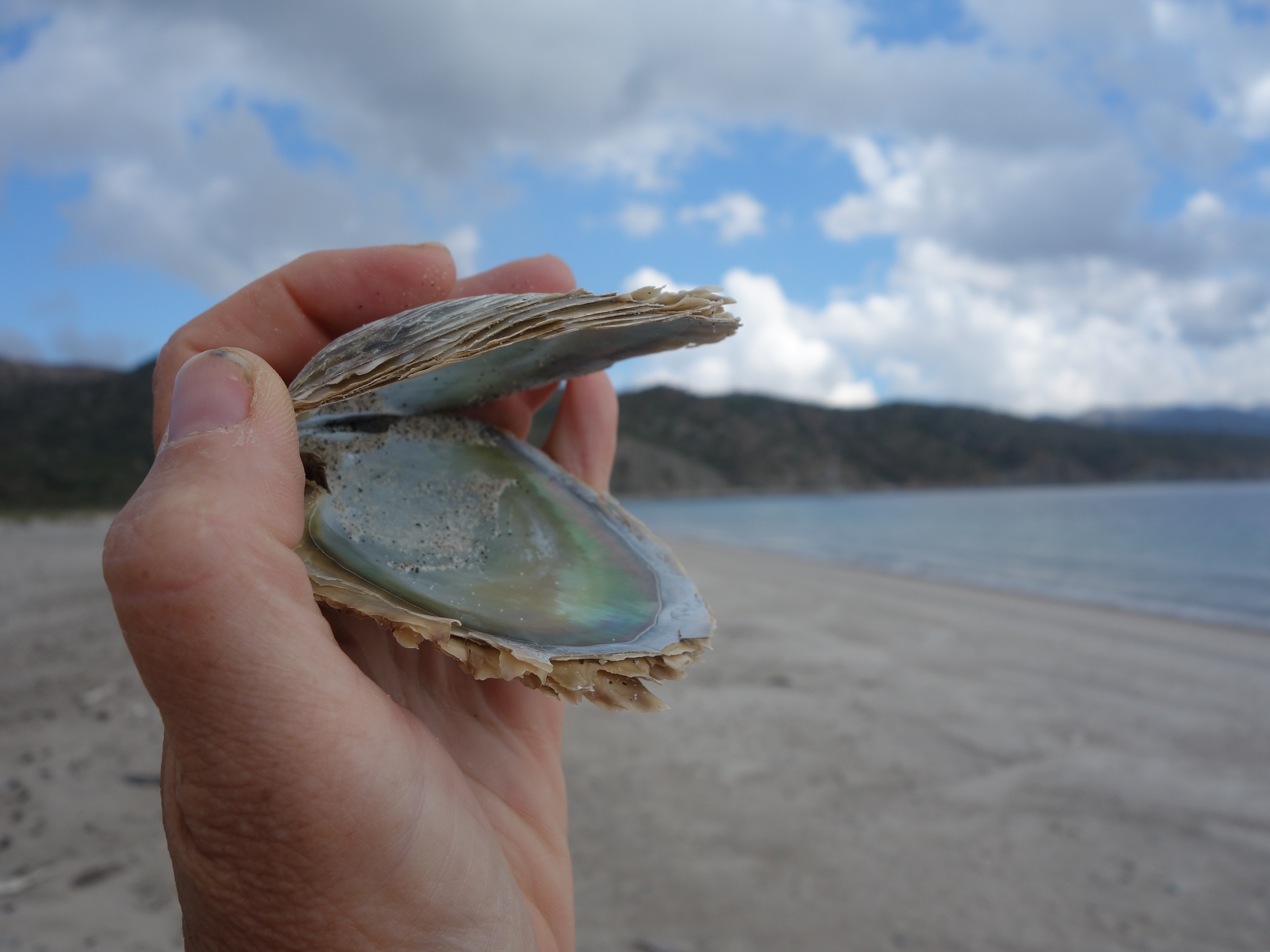 Pteria sterna, a rainbow-lipped pearl oyster. Thrown ashore this year in large numbers, these rare native oysters can produce the most beautiful and valuable pearls in the world.