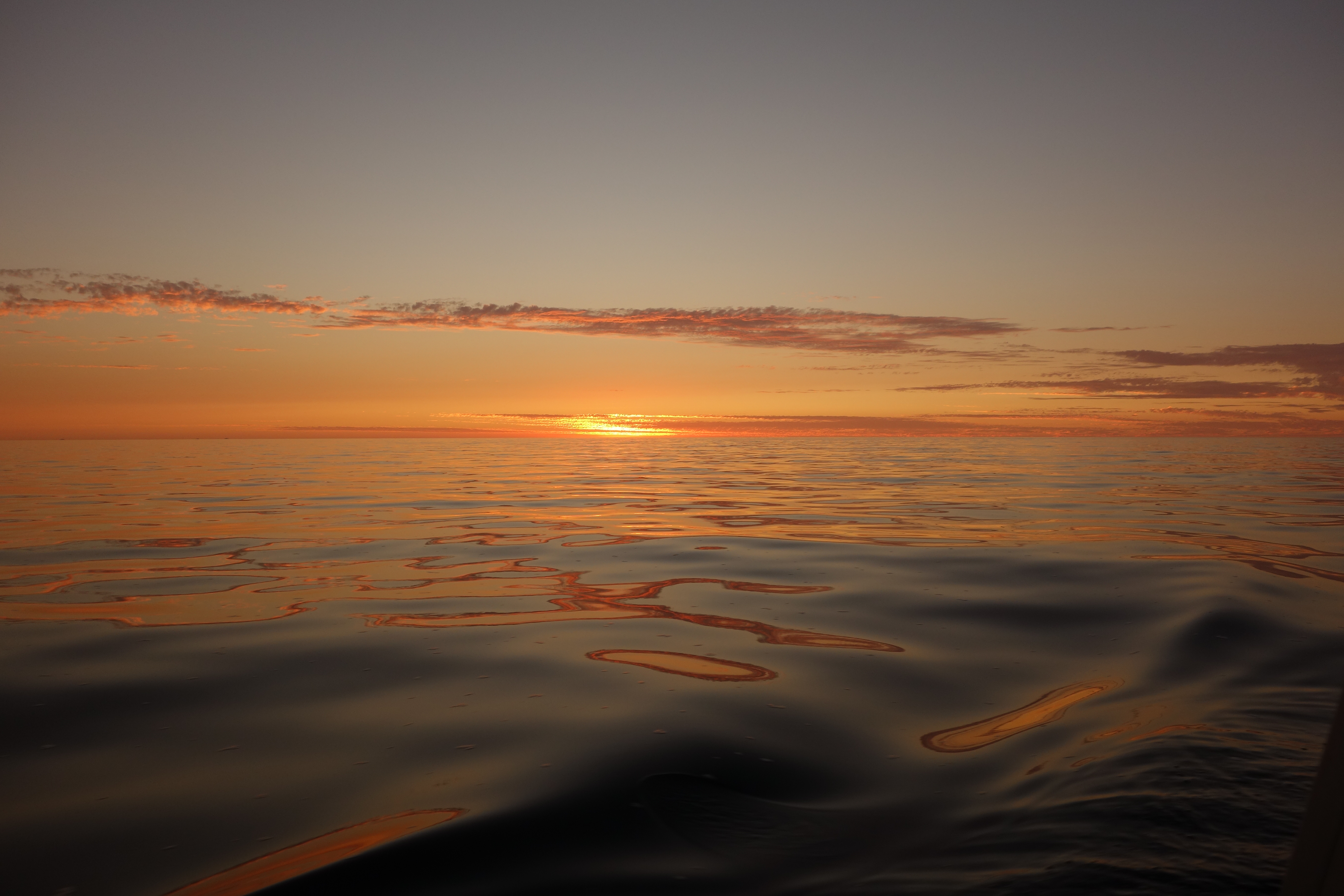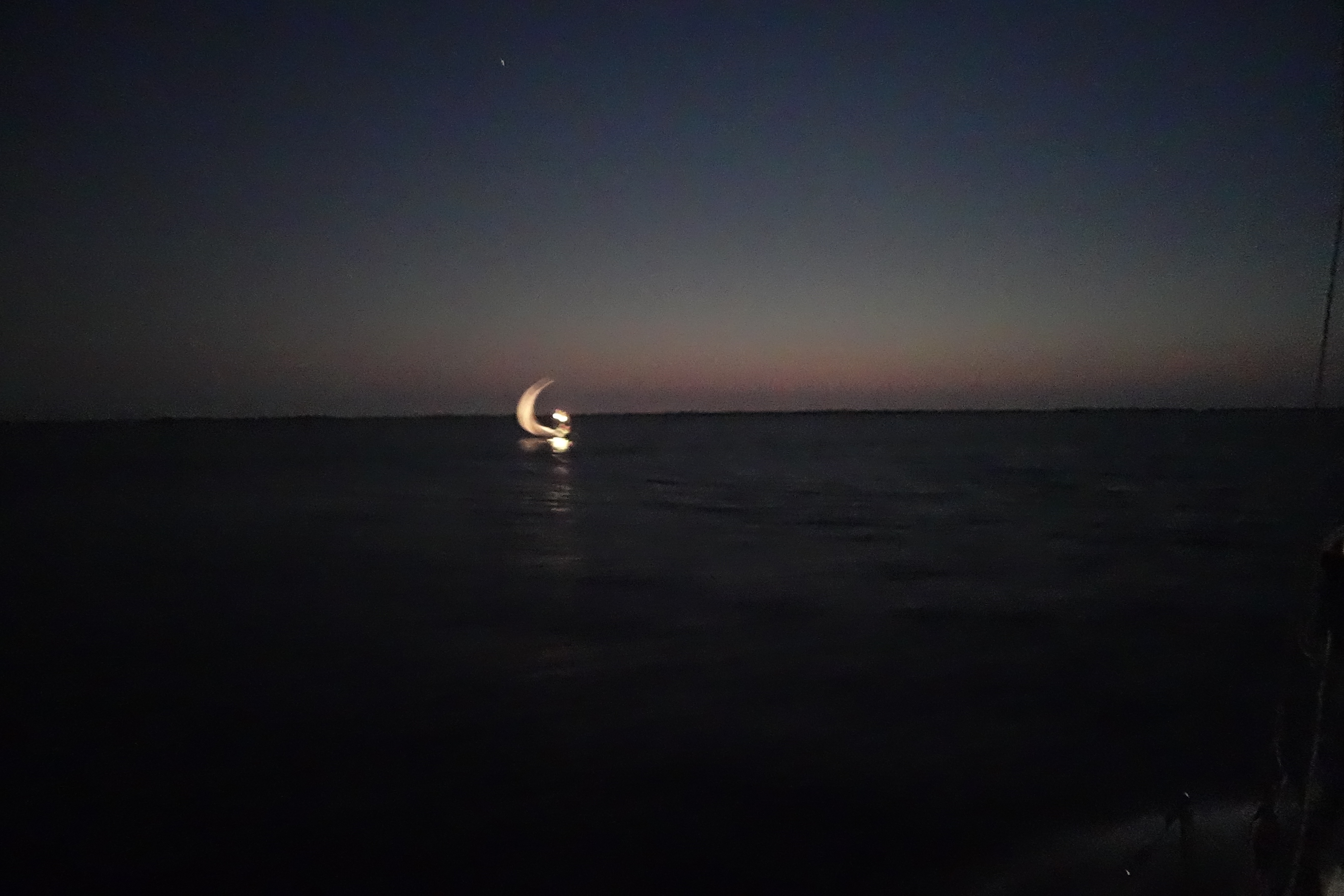 We commenced motorsailing when our speed dropped below three knots. Early in the morning, we began to pick up small boats and buoys on the radar, and several times we were flashed with a bright light by solo fishermen in pangas* who wanted us to avoid them, and/or their nets, and so we weaved through the darkness. One mile off, we could see Ahmeek’s running lights: red, then green, then red again, confirming visually what they had told us on the radio: fishing nets all around. The lights of larger fishing vessels shone in the distance: shrimpers and trawlers and purse seiners, and we made multiple minor course adjustments to avoid them all. Under such pressure, how can there be anything alive left in the sea? After a couple of hours we got through the worst of it, and soon both boats were able to turn off the engines for a few hours when the wind came up. By mid morning, however, we were back to motoring.