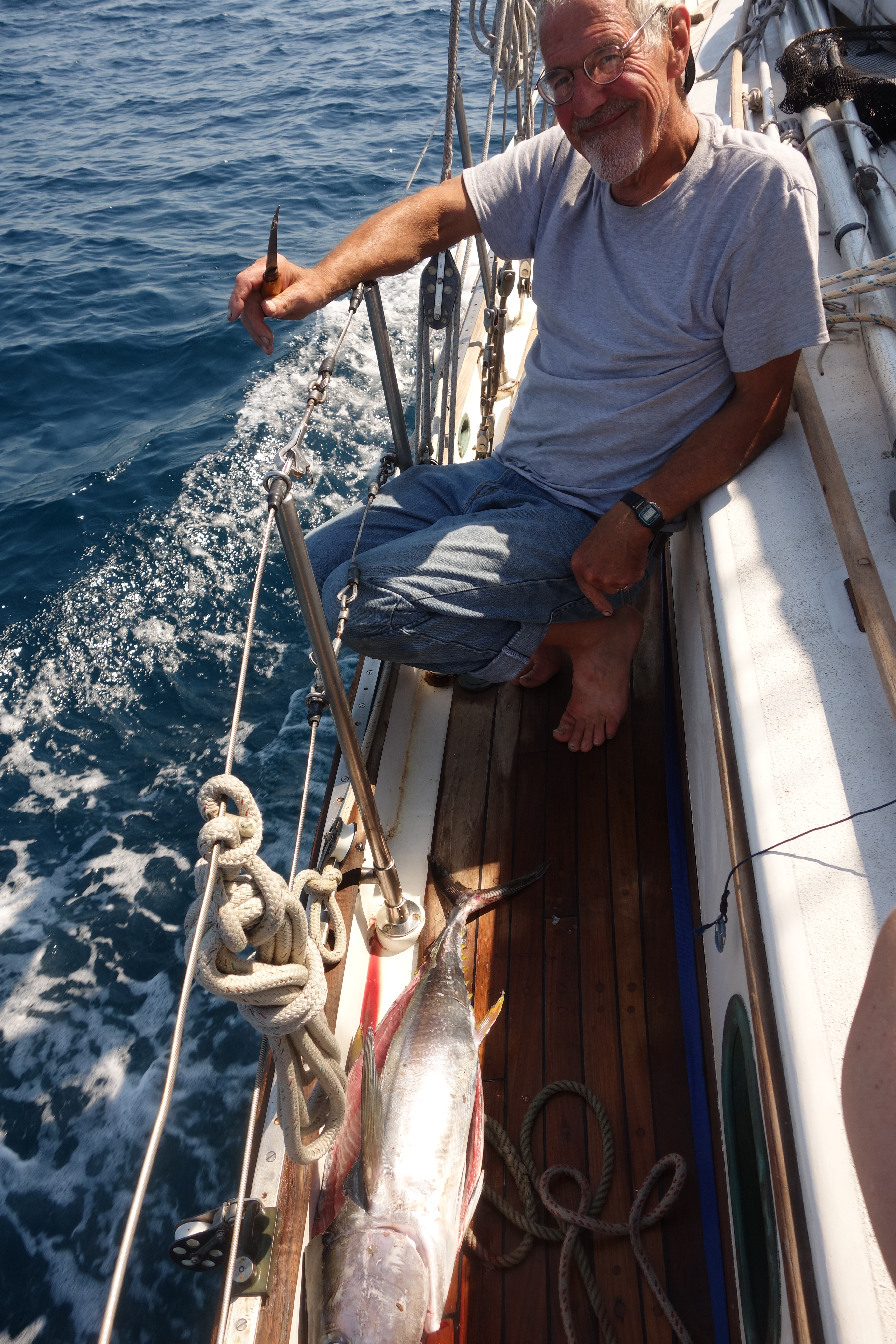 Pillowy seas smeared sky-reflected colors around the hull, and we endured the iron genoa for the next day and night. On the third day, we all agreed that a sojourn in seldom-visited Bahia Altata would give the motoring a rest and a chance for more wind after a few days. We altered course ten degrees to bring us to the bar, and while motoring along in 40 feet of water, Wade hooked and brought onboard a 25 pound yellowfin tuna. What a feast we would have later that night! And for the next three days! And to be shared with Ahmeek and their (4) cats! Sashimi, pan-seared steaks, grilled roasts, salads and sandwiches. Everything but the tuna casserole.