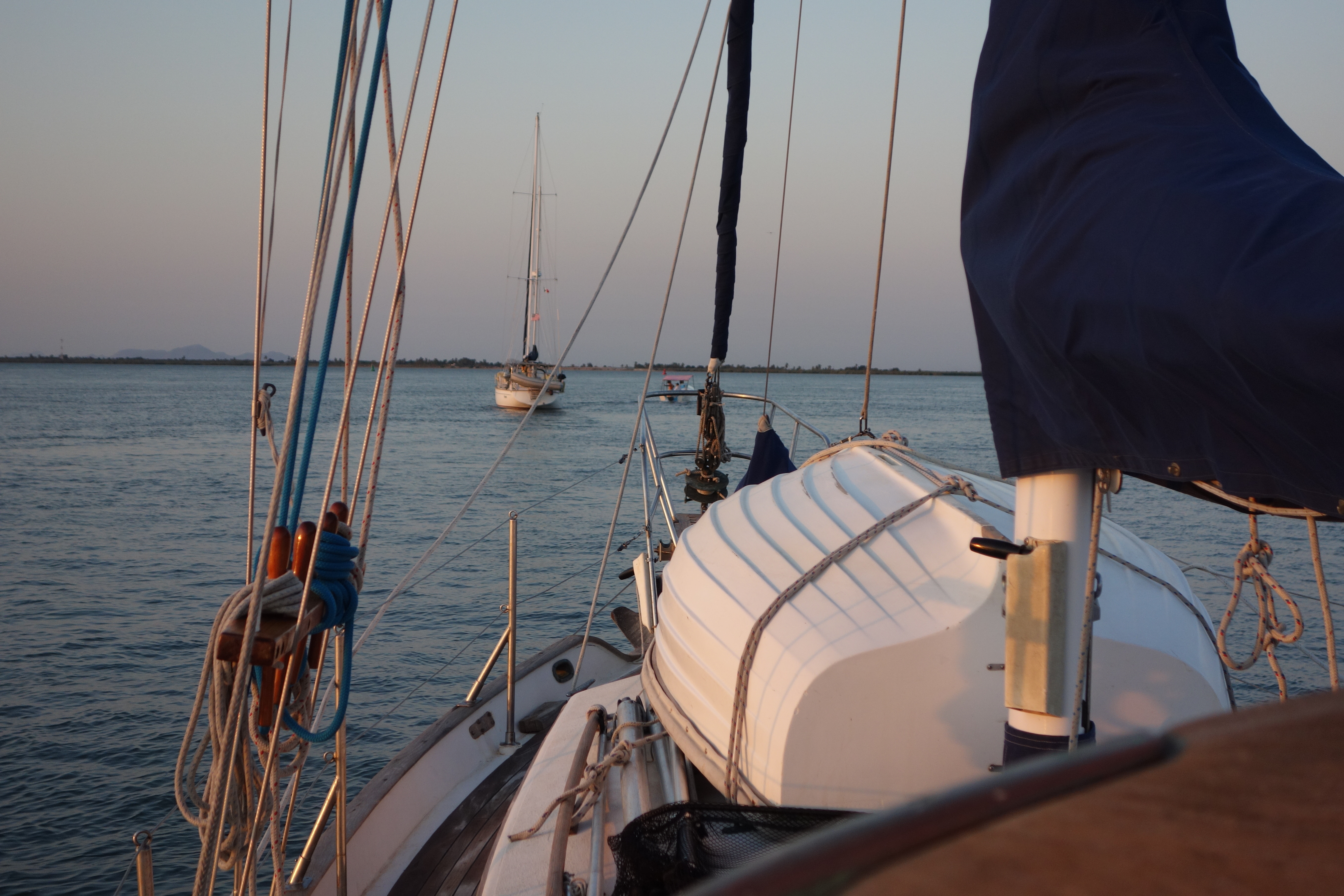 We left San Carlos on a comfortable and fast beam reach. Ahmeek’s main and mizzen sails bladed through the humid air, foresail pointed south, white wings steady in the nearly flat sea. Pelican Moon paralleled her course a half mile off, and with her own three sails pulling easily, both boats made an easy six to six and a half knots. Looking forward to a four day passage to Mazatlan with a bright moon guiding the way, we were relaxed and happy to finally be on our cruise.
