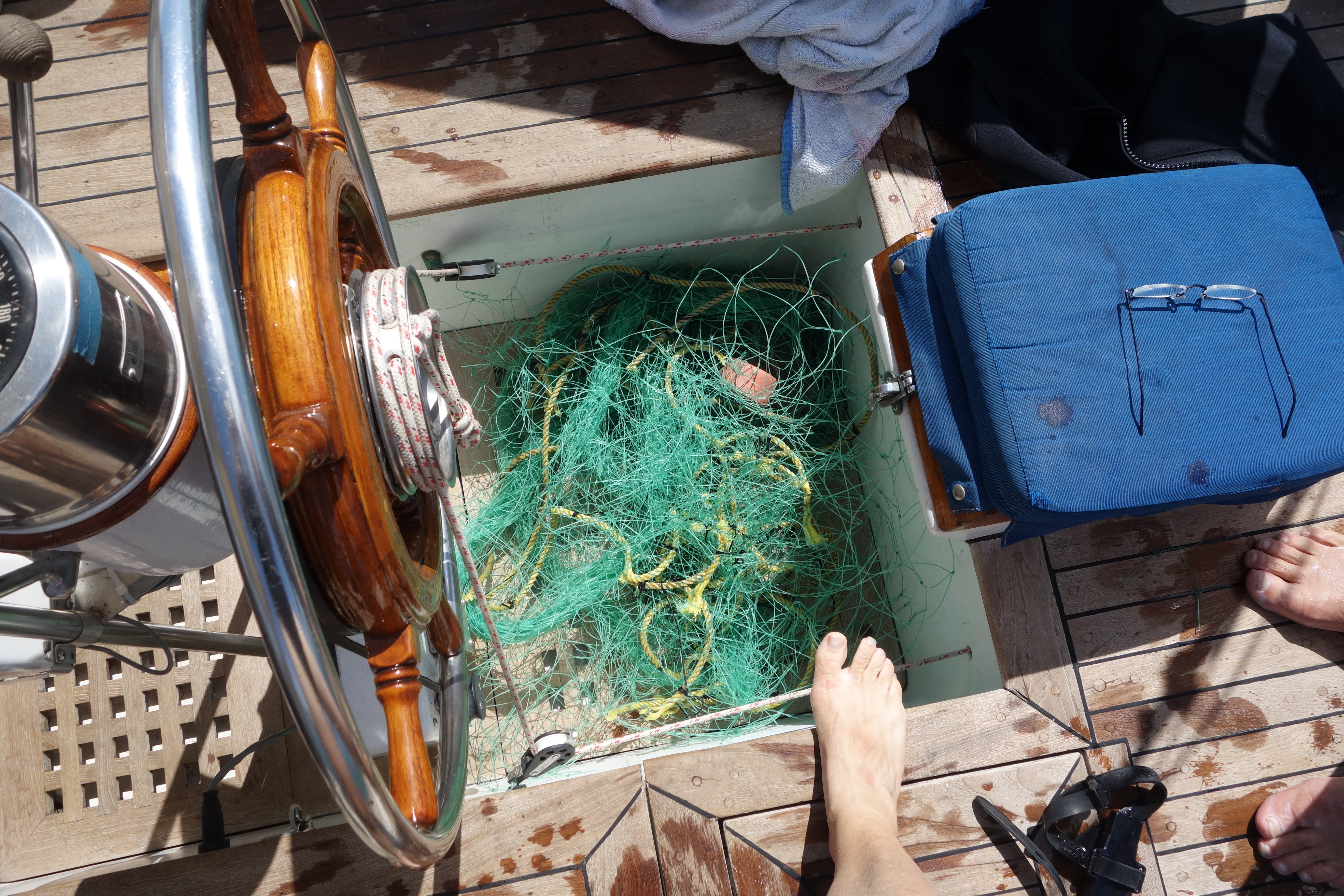 This is what the cockpit looks like when a sailboat runs over an unlit fishing net in the dark, turns around and sails all night back to the same bay, and the crew swims for two hours cutting the prop free.