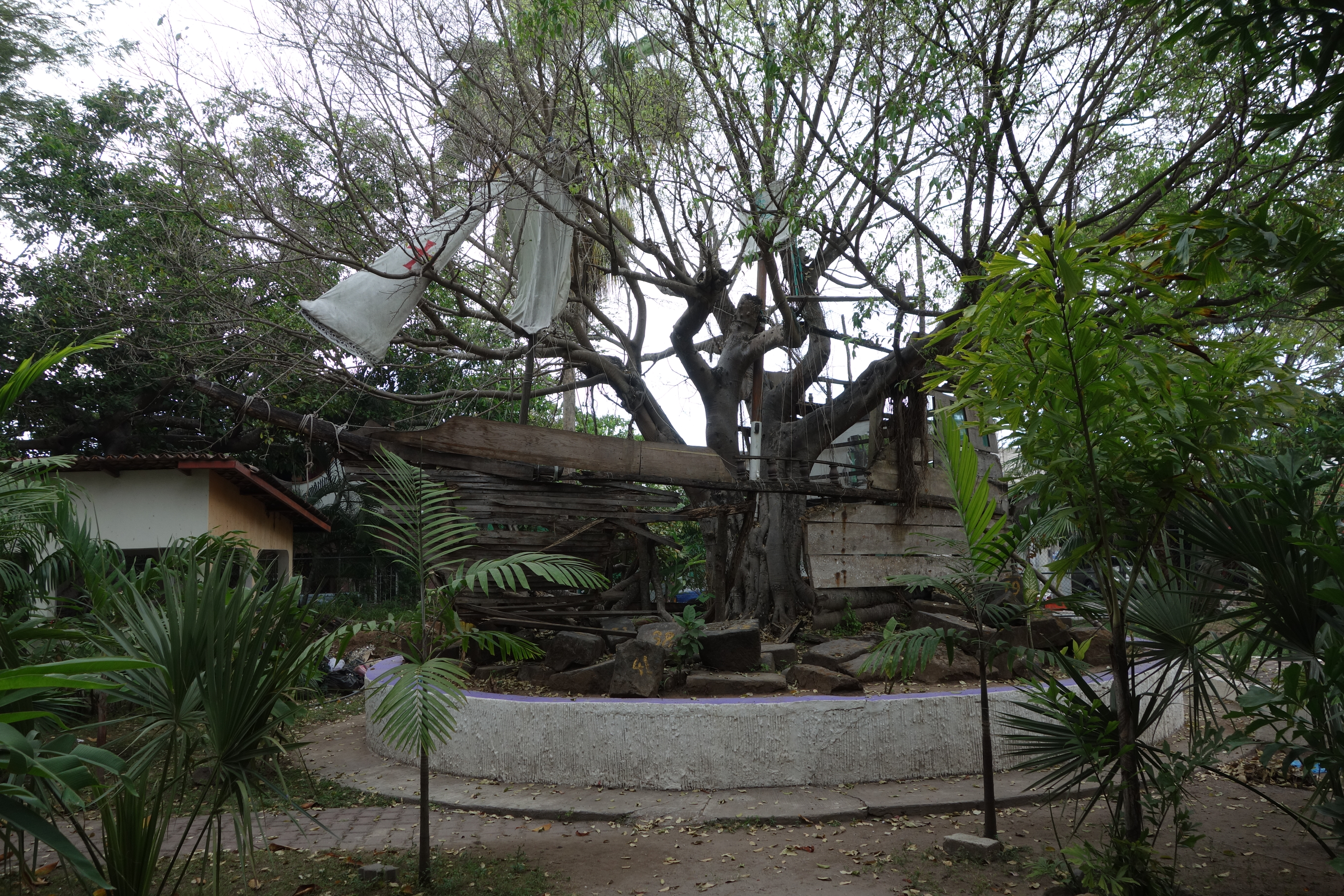 We found a giant tree in the courtyard, and people have built a pretend spanish galleon in the branches. Can you find it?